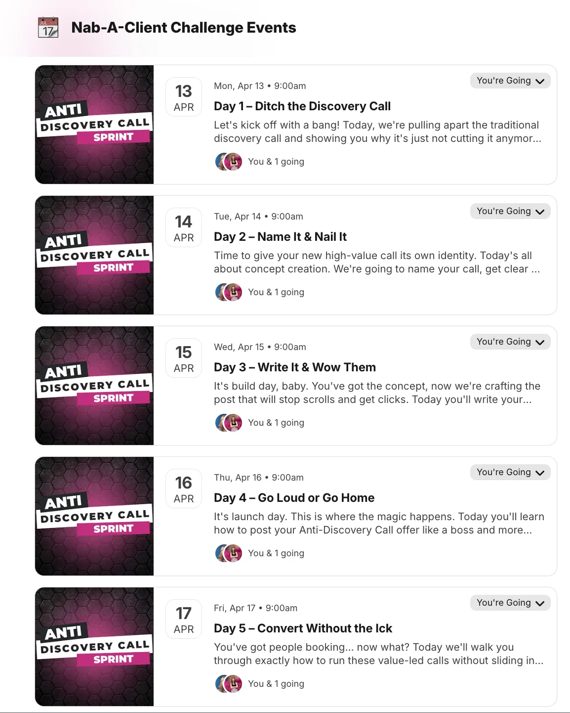 Each sprint is one week, ~60 minutes a day, step-by-step, with a crew of rebels doing it alongside you. By Friday, you’re done - and you’ve booked calls.
